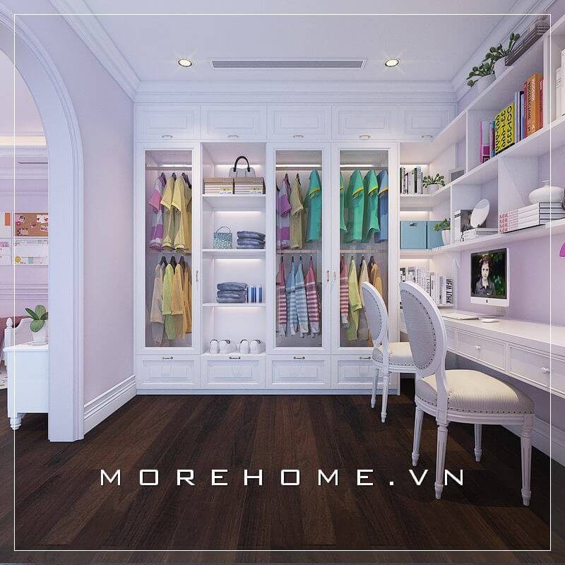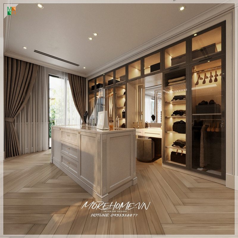 Điểm đặc biệt trong không gian phòng thay đồ đó là sự kết hợp hoàn hảo giữa tủ quần áo cánh kính với bàn trang điểm. Tủ quần áo hiện đại, cao cấp đi kèm theo đó là bàn trang điểm sang trọng mang đến 1 ấn tượng khó tả trong lòng quý khách hàng.