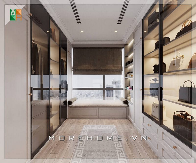 Tủ quần áo hiện đại kết hợp gỗ và kính sang trọng, trẻ trung lại tiện lợi để trưng bày túi xách phần nội thất đặc biệt trong thiết kế biệt thự, nhà phố