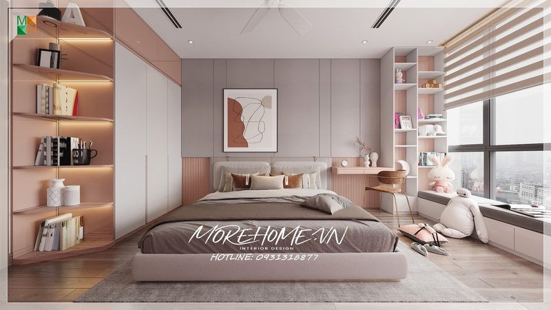 Ấn tượng với mẫu giường ngủ hiện đại đầu giường bọc nệm màu hồng rất nổi bật và nữ tính dành cho các cô con gái hoặc các bạn gái dễ thương.