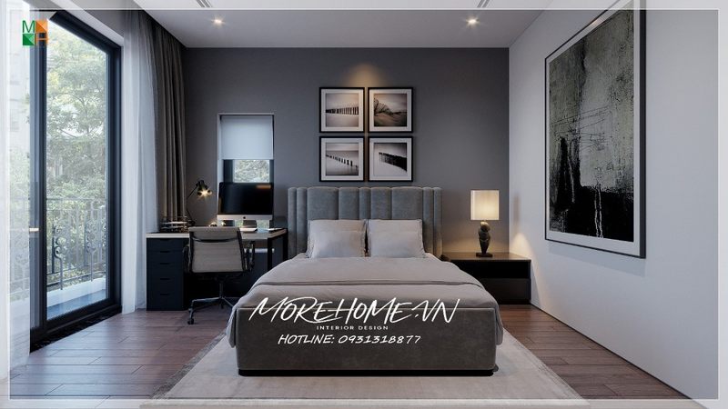 Chiếc giường được bọc nệm đầu giường đơn giản tạo sự thoải mái cho căn phòng