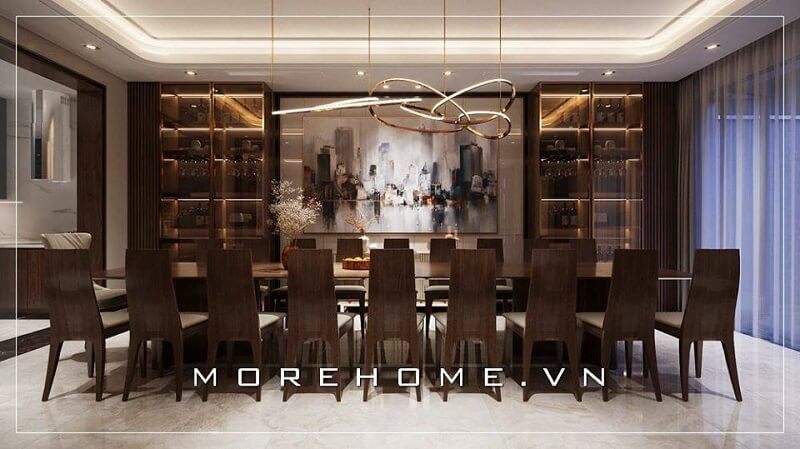 Bạn sẽ phải trầm trồ với mẫu thiết kế bàn ghế ăn gỗ óc chó sang trọng với kích thước lớn lên đến 18 ghế ăn mang đến một không gian phòng ăn hoàng gia, đẳng cấp